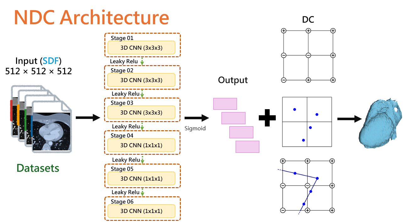 傳統醫學影像三維重建多仰賴幾何演算法,容易在細節還原與拓樸結構重現上出現不足。 本研究採用深度學習驅動的心臟電腦斷層影像三維表面網格重建方法,並結合神經雙重輪廓技術,以提升心臟輪廓擬合的精度與拓樸一致性。 研究採用振興醫院提供之五組心臟電腦斷層影像資料,將原始神經成像檔案重採樣至固定解析度:512 × 512 × 512,並將生成的體素遮罩與符號距離場資料一併儲存為 HDF5 檔案格式,作為模型訓練之用。 為全面評估所提方法之效能,實驗中同時比較了神經行進立方體架構與傳統視覺化工具函式庫裡的 Marching Cubes 模組,並在應用程式 MeshLab 中將各方法生成之三角網格進行幾何與視覺品質比較。 實驗結果顯示,所提神經雙重輪廓方法在高解析度條件下能產出具平滑表面與拓樸一致性的網格模型。相較之下,神經行進立方體在尖銳特徵擬合上表現較佳,而視覺化工具函式庫基於 Marching Cubes 的重建則易出現拓樸漏洞及表面雜訊。 深度學習重建方法皆優於傳統演算法,驗證其於醫學影像三維重建任務中的可行性與應用潛力。