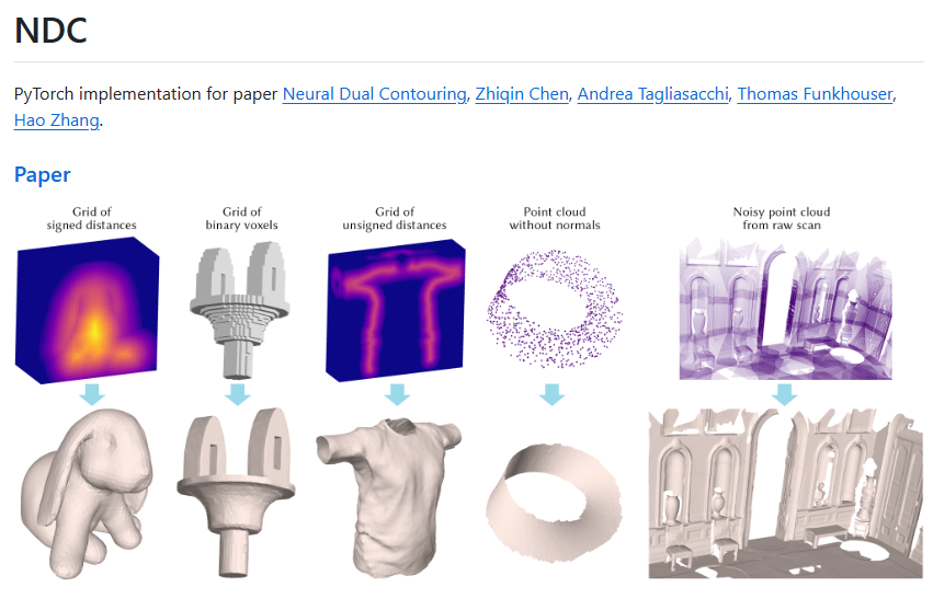 [1] Zhiqin Chen, Andrea Tagliasacchi, Thomas Funkhouser, and Hao Zhang. Neural dual contouring. ACM Trans. Graph., 41(4), July 2022.